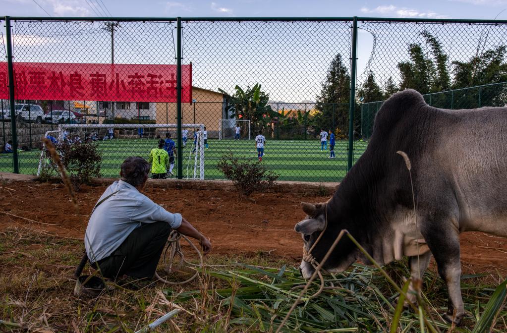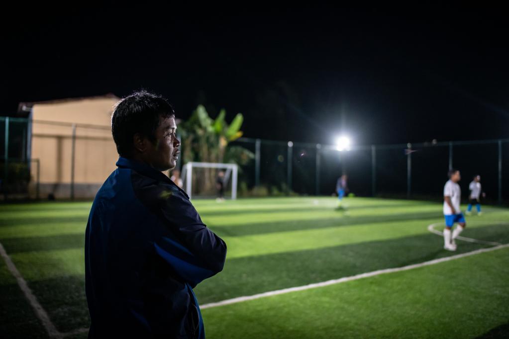 云南省滄源佤族自治縣龍乃村首任足球隊隊長鮑志昆在場邊看隊員們踢球。