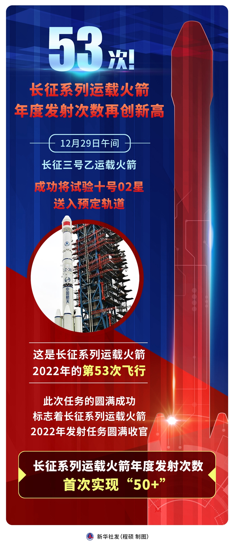 12月29日午間,長征三號乙運載火箭成功將試驗十號02星送入預定軌道。這是長征系列運載火箭2022年的第53次飛行。此次任務的圓滿成功標志著長征系列運載火箭2022年發射任務圓滿收官,長征系列運載火箭年度發射次數首次實現“50+”。
