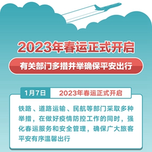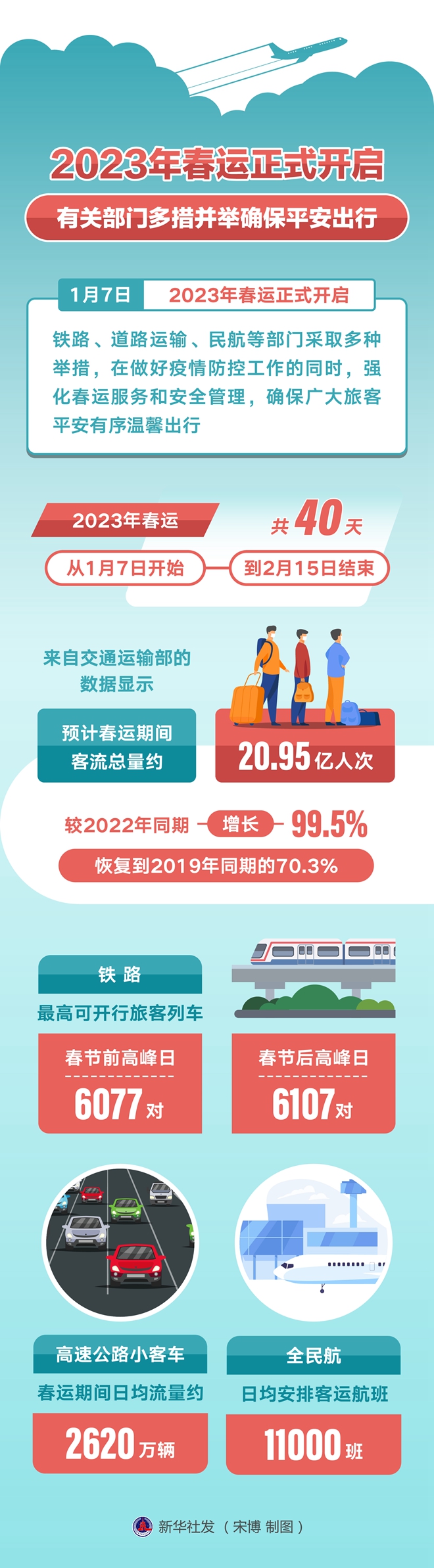 2023年春運從1月7日開始,到2月15日結束,共40天。來自交通運輸部的數據顯示,預計春運期間客流總量約為20.95億人次,較2022年同期增長99.5%,恢復到2019年同期的70.3%。鐵路春節前高峰日最高可開行旅客列車6077對,節后高峰日最高可開行旅客列車6107對,高速公路小客車春運期間日均流量約為2620萬輛,全民航日均安排客運航班11000班。