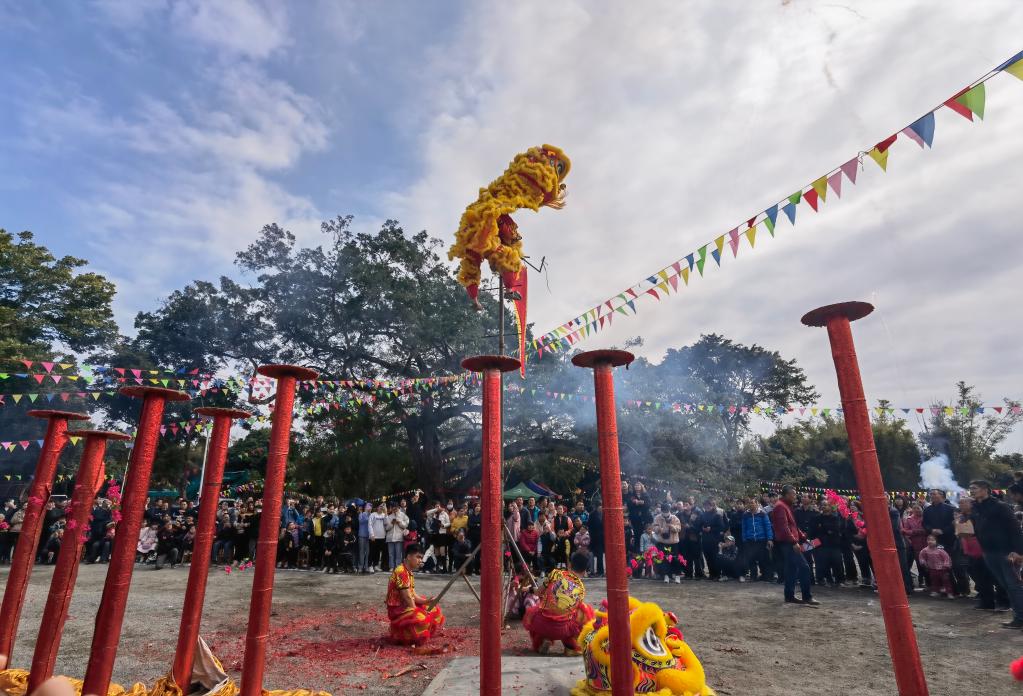 在廣西藤縣和平鎮白沙村400多年的古樹下,村里的老老小小聚在一起祈福迎春。舞獅人早早來到這里,威嚴的獅樁陣一字擺開,好奇的村民昂頭望向樁頂,想象著這將會是一場多么精彩的舞獅表演。