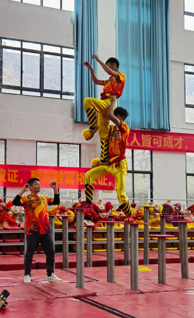 獅頭獅尾兩人默契配合、行云流水,在高樁上表演著一系列高難度動作:“金獅倒掛”“絕壁采靈芝”“探峰攀崖”“獨樁挾腰轉體450°絕技”……驚險刺激而又出神入化的表演,引得觀眾連連拍手叫絕:“原來高樁上還可以這樣舞獅!”