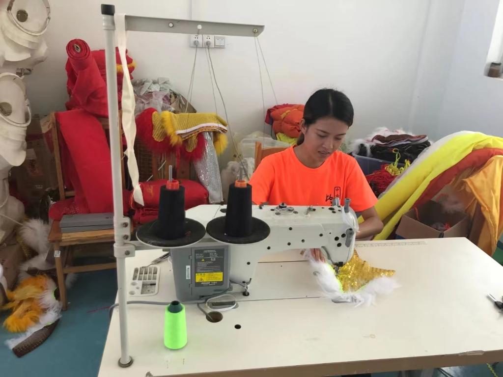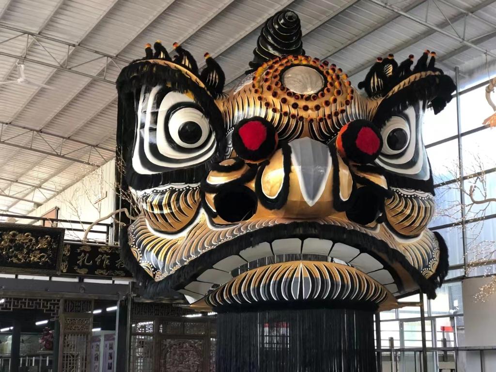 走進占地1000多平方米的扎作藝術館,首先映入眼簾的是一個巨型的獅頭扎作品,雄獅惟妙惟肖,神氣十足。平日里,學生們就是在這里制作出一套套精美的獅頭獅袍和文創產品。