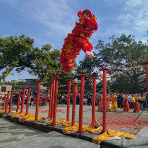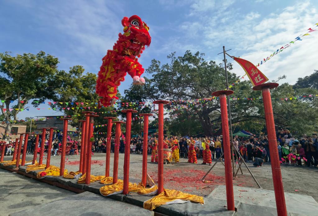 幾個歡天喜地的互動節目過后,壓臺戲登場。由兩位舞獅人扮演的雄獅縱身一躍,跳上高聳的獅樁陣。這組高樁由21個樁柱組成,樁面直徑為38厘米,樁柱高在1.2米到2.5米之間,兩樁之間最大跨度為1.8米。