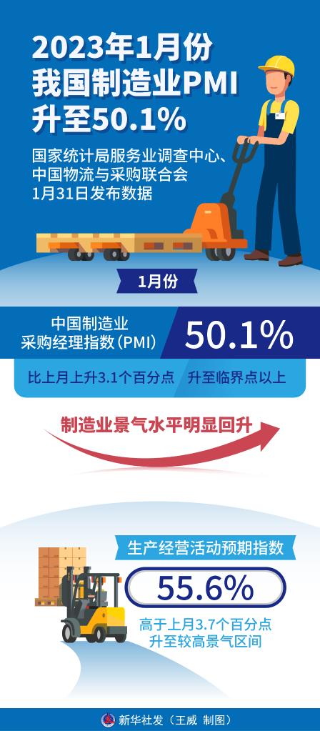 新華社北京1月31日電(記者魏玉坤、韓佳諾)國家統計局服務業調查中心、中國物流與采購聯合會1月31日發布數據,1月份,中國制造業采購經理指數(PMI)為50.1%,比上月上升3.1個百分點,升至臨界點以上,制造業景氣水平明顯回升。
