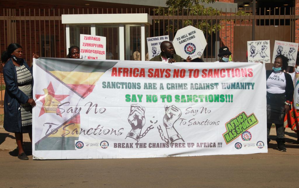 2022年7月4日,在津巴布韋首都哈拉雷的美國駐津使館門前,津巴布韋“廣泛反對制裁聯盟”組織成員手舉標語牌,反對美國及其西方盟友對津巴布韋的長期經濟制裁。新華社發(塔法拉·穆瓜拉攝)