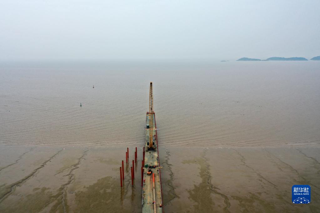 工程人員在通蘇嘉甬高鐵杭州灣跨海鐵路大橋施工現場鋪設棧橋,為后期工程做準備(2023年2月1日攝,無人機照片)。2022年11月30日開工建設的通蘇嘉甬高鐵杭州灣跨海鐵路大橋全程跨海,總長約29.2公里,為設計時速350公里的雙線高速鐵路橋,是目前世界上在建長度最長、建設標準最高的高速鐵路跨海大橋。新華社記者 黃宗治 攝