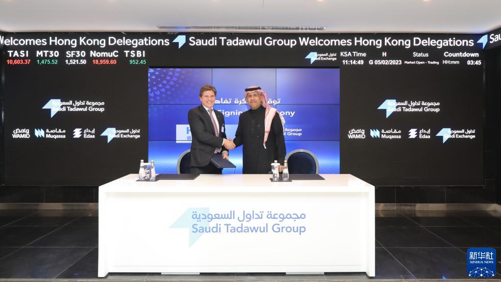 2月5日,在沙特阿拉伯首都利雅得,香港交易所集團行政總裁歐冠升(左)與沙特證交所集團首席執行官哈立德·胡桑簽署合作備忘錄。新華社發(香港交易所供圖)
