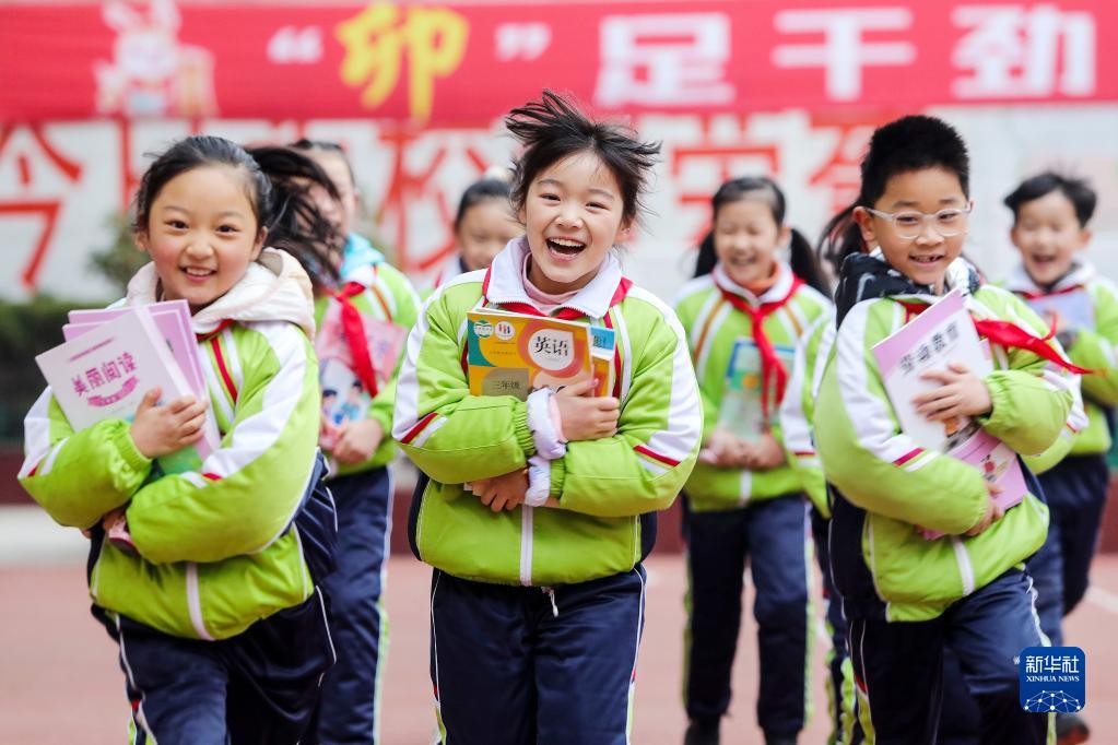 2月6日,安徽省淮北市第三實驗小學,學生們領到新課本。新華社發(萬善朝 攝)
