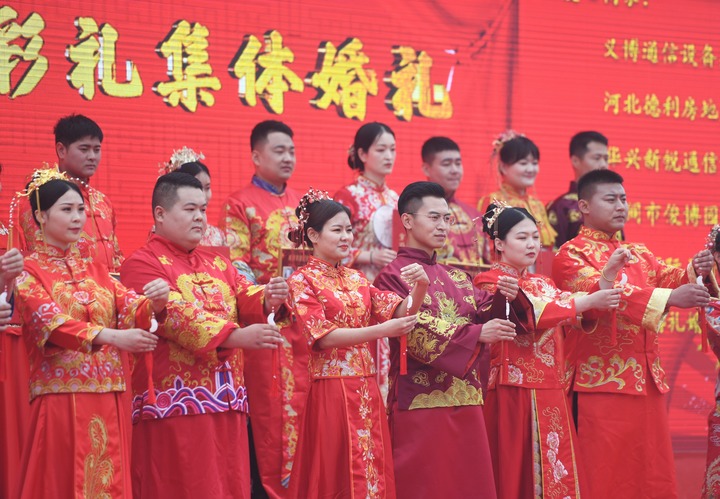 大紅的喜字、鮮艷的綢緞、芬芳的鮮花……2022年5月20日,被裝點得喜氣洋洋的河間市大莊村紅色禮堂內,正在舉行一場零彩禮集體婚禮。來自興村鎮北李子口村的一對新人——明亮、趙聰敏,身穿中式喜服,和其他6對新人一起,在鄉親們的祝福下掀蓋頭、拜天地、行結發禮。