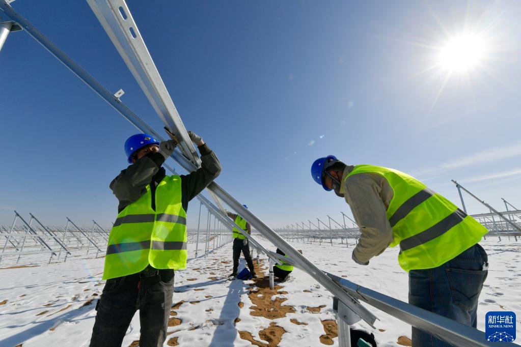 2月16日,在古浪縣黃花灘一處光伏發電項目建設現場,工人安裝光伏支架。
