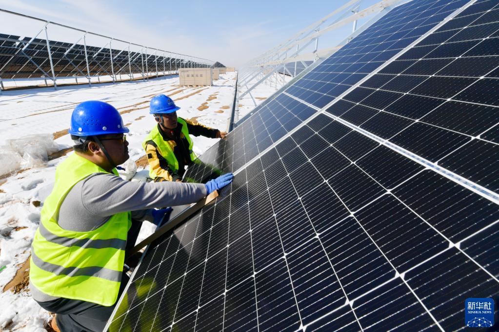 2月16日,在古浪縣黃花灘一處光伏發電項目建設現場,工人安裝光伏組件。