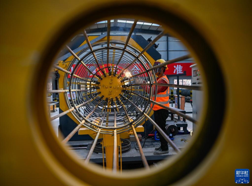 2月17日,在位于達州市境內的中鐵四局西渝高鐵鋼筋加工廠,工人在焊接鋼筋籠。