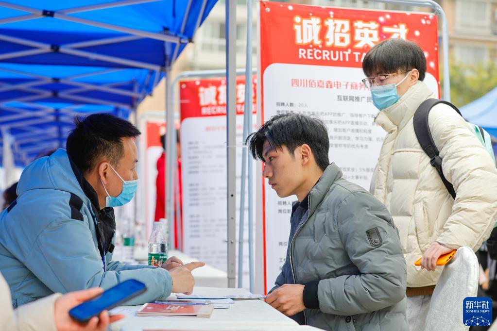 2月17日,在中國成都人力資源服務產業園,求職者(中)與招聘企業工作人員交流。