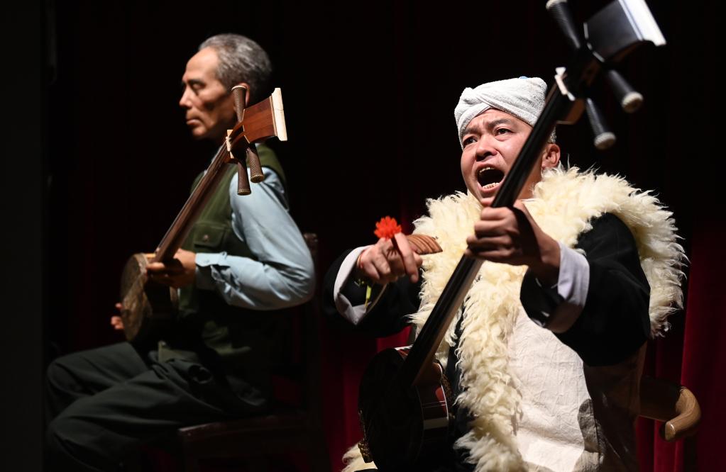 陜北說書藝人陳文藝(右)在陜北民歌博物館為觀眾表演陜北說書。新華社記者 陶明 攝