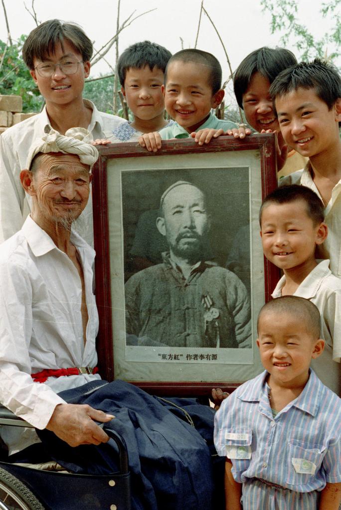 1942年正月,陜北農民李有源用民歌的調子唱出“東方紅,太陽升,中國出了個毛澤東……”這首歌在中國大地上被廣為傳唱。圖為李有源的兒孫們與老人的照片在一起。(1999年9月發) 新華社記者 陶明 攝