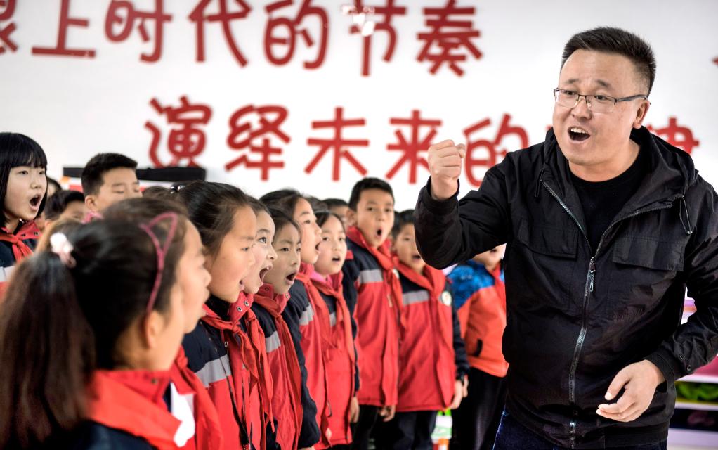 歌手在延安市安塞區教授小學生陜北民歌演唱技巧。 新華社記者 陶明 攝