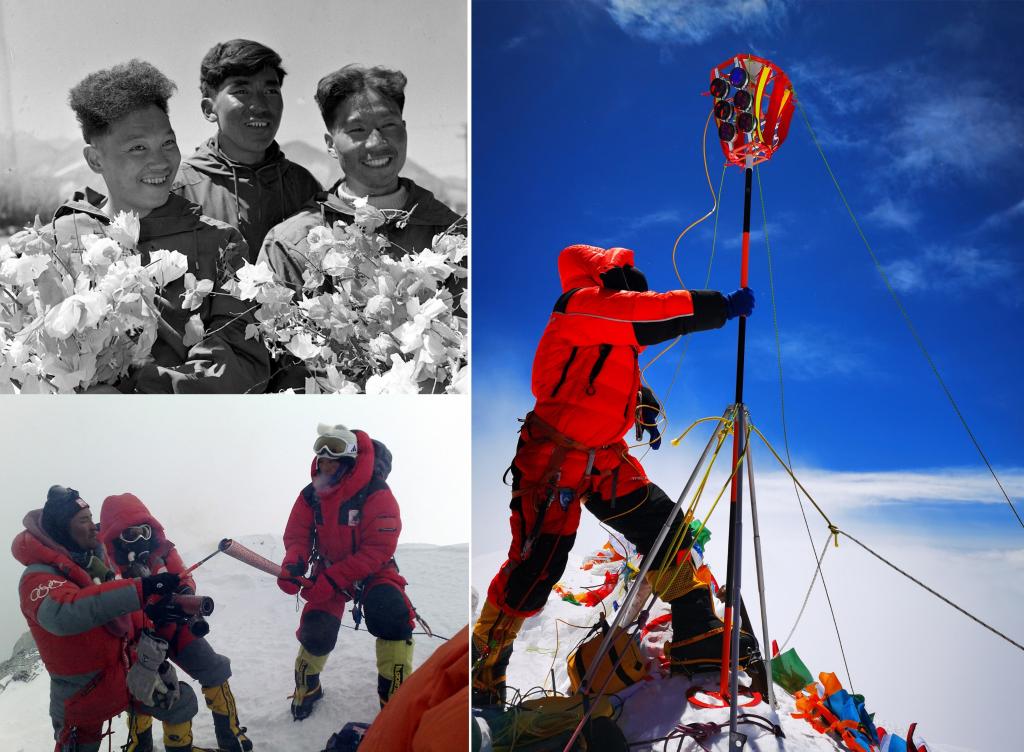 拼版照片:左上圖為1960年5月登上珠穆朗瑪峰峰頂的中國登山隊隊員王富洲(右)、貢布(中)和屈銀華(資料照片,新華社發);左下圖為2008年5月8日,北京奧運圣火珠峰傳遞登山隊隊員羅布占堆(左)點燃第一棒火炬手吉吉手中的“祥云”火炬(新華社發);右圖為2020珠峰高程測量登山隊隊員在珠穆朗瑪峰峰頂開展測量工作(2020年5月27日新華社特約記者扎西次仁攝)