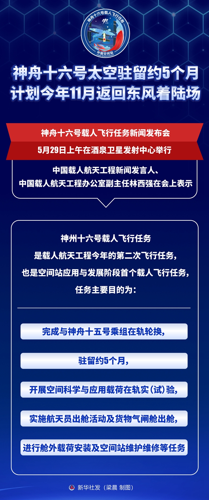 新華社酒泉5月29日電 神舟十六號載人飛行任務新聞發布會5月29日上午在酒泉衛星發射中心舉行。中國載人航天工程新聞發言人、中國載人航天工程辦公室副主任林西強在會上表示,神舟十六號載人飛船駐留約5個月,計劃于今年11月返回東風著陸場。