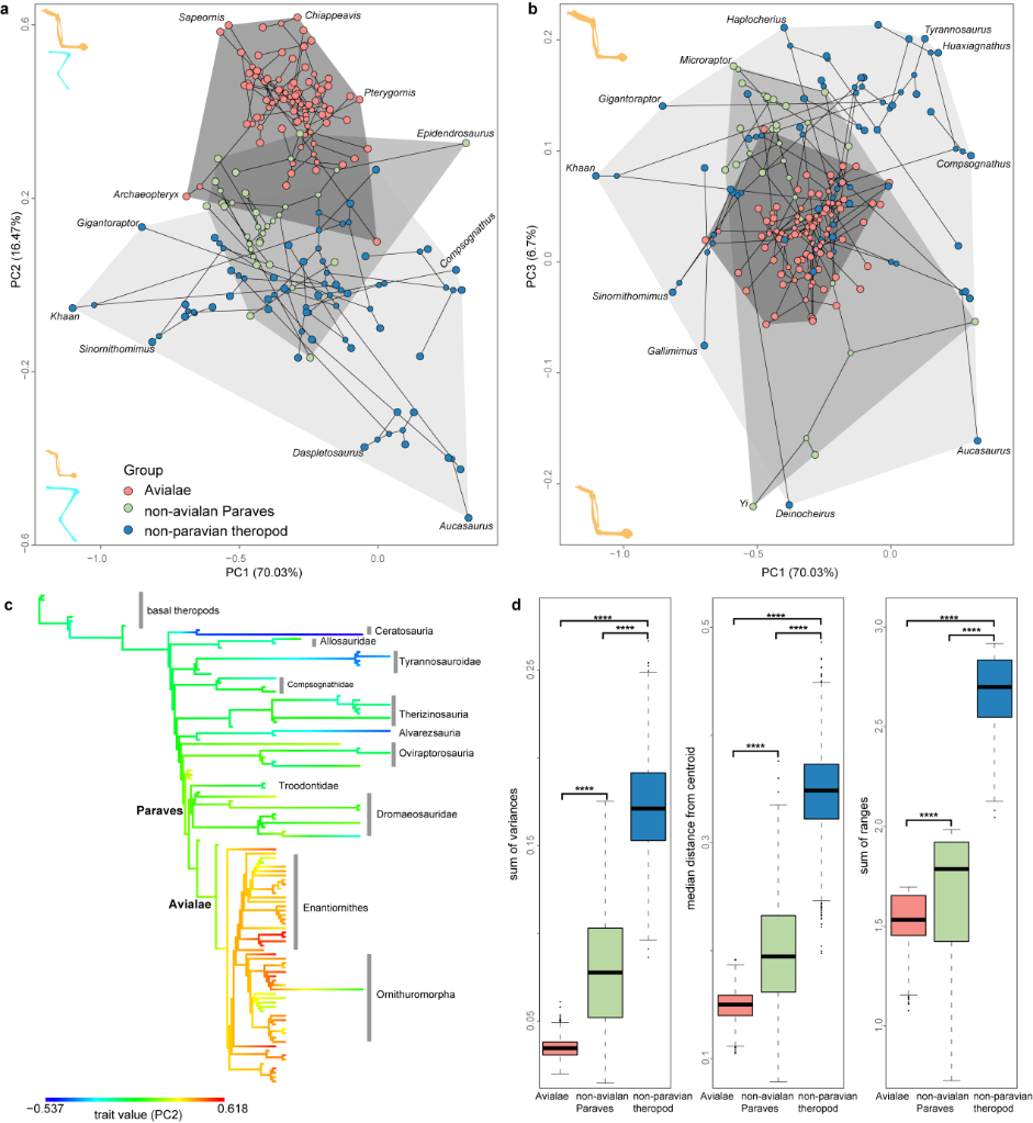 最早的鳥類出現于中生代時期。研究人員通過構建包含鳥類在內的大量中生代獸腳類恐龍肢骨的形態演化空間,并量化鳥類、非鳥類副鳥類和非副鳥類獸腳類恐龍這三個類群的肢骨多樣性,發現早期鳥類四肢骨骼的整體多樣性低于其他非鳥類獸腳類恐龍,類似的差異也反映在前肢上。但是當研究對象聚焦于后肢時,差異就不明顯。