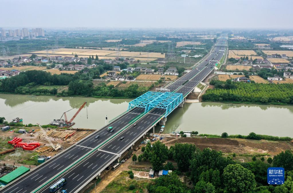 京滬高速公路擴建工程新通揚運河大橋現場(6月6日攝,無人機照片)。