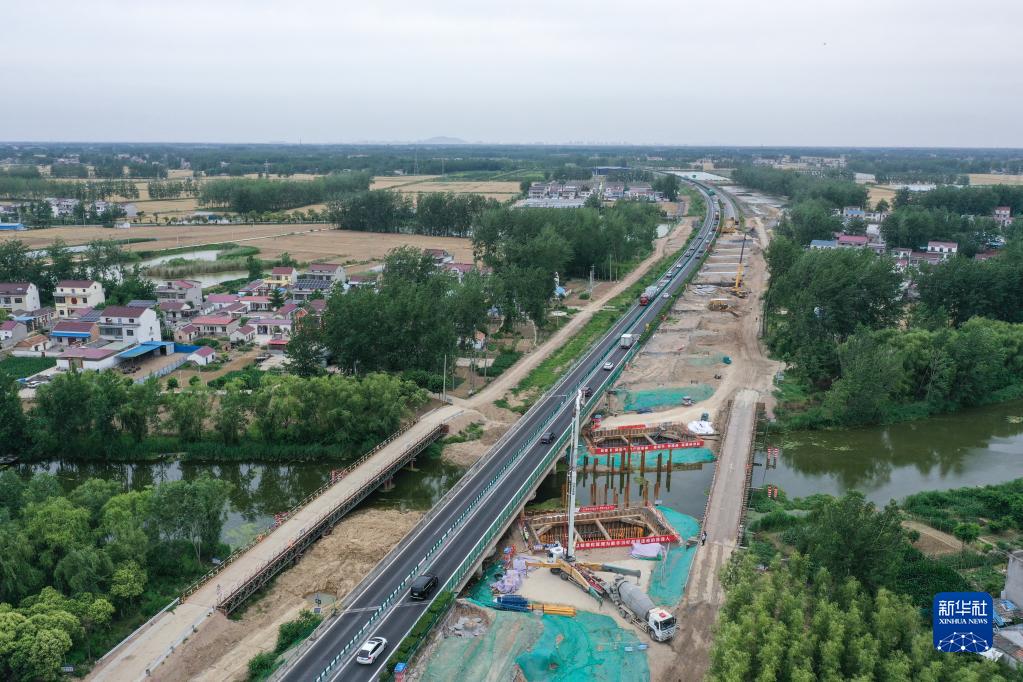 工人在長深高速公路連云港至淮安段擴建工程李柴河大橋現場澆注橋墩(6月7日攝,無人機照片)。