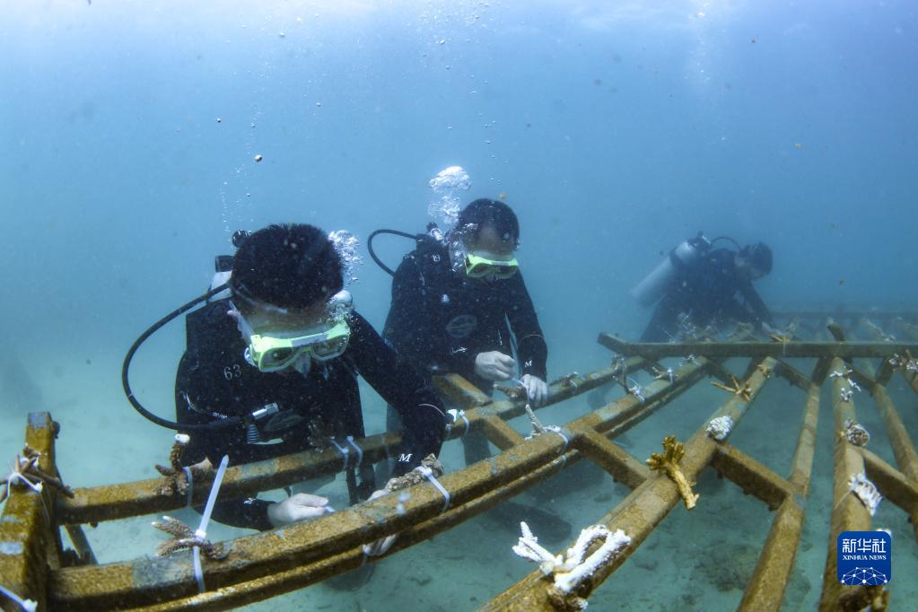 6月8日,海南省海洋與漁業科學研究院的專家和潛水員在海南陵水分界洲島附近海域移植珊瑚。