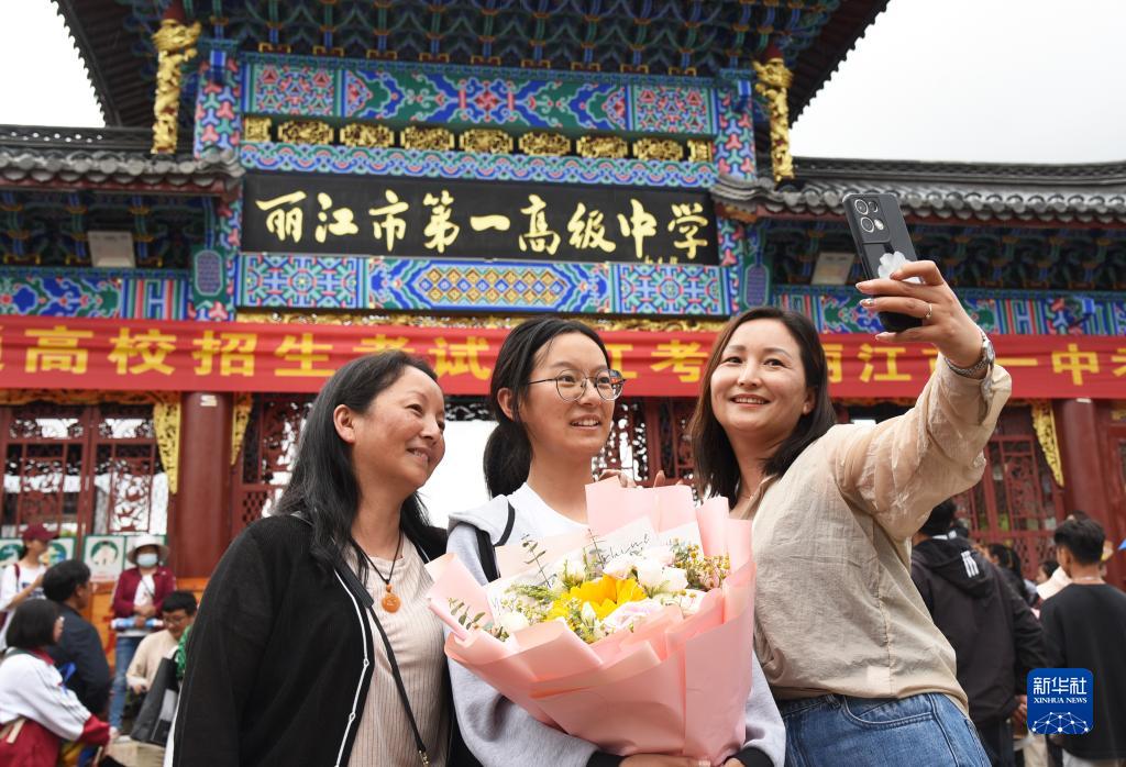 6月8日,在云南麗江市一中考點,考生在考試結束后與家人合影。