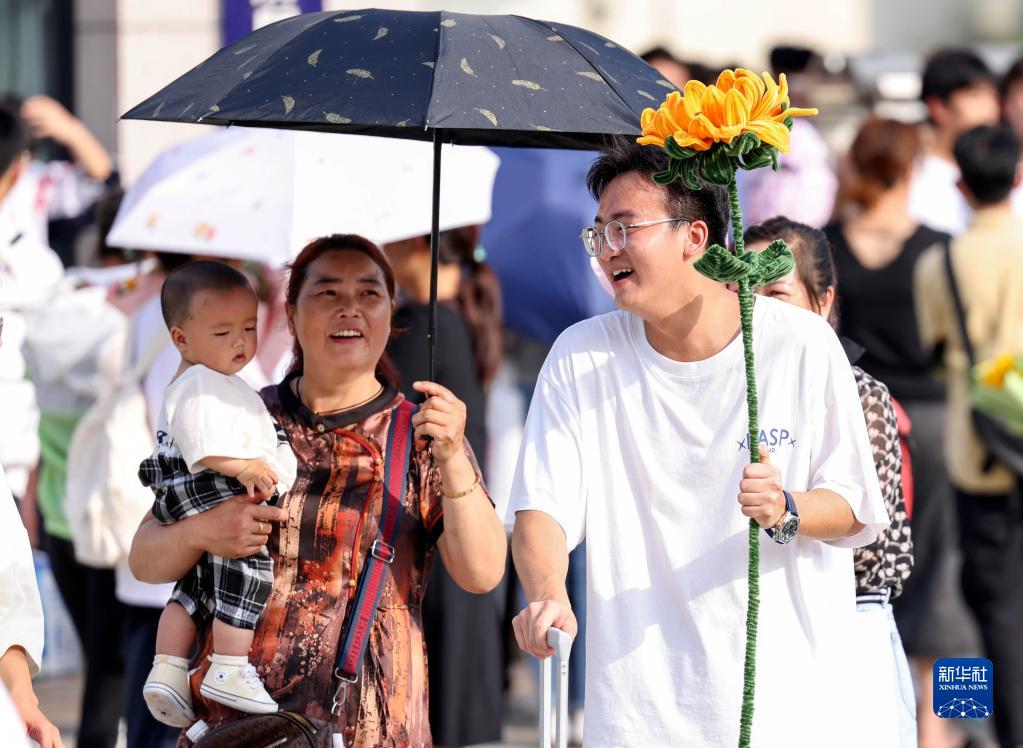 6月8日,在貴州省銅仁市玉屏侗族自治縣民族中學考點,家長為結束高考的考生送上寓意“一舉奪魁”的“葵花”。