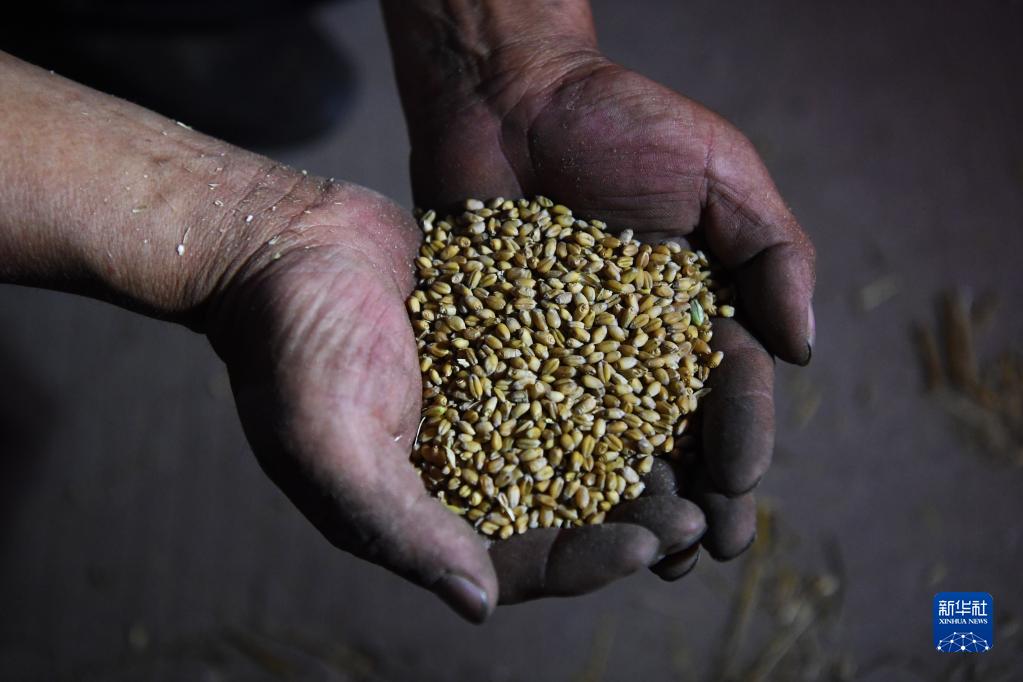 6月7日晚,袁營村村民展示剛收獲的小麥。