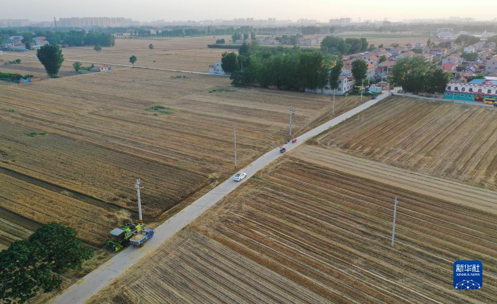 6月7日,在滑縣棗村鄉袁營村,收割機將收獲的小麥裝車(無人機照片)。