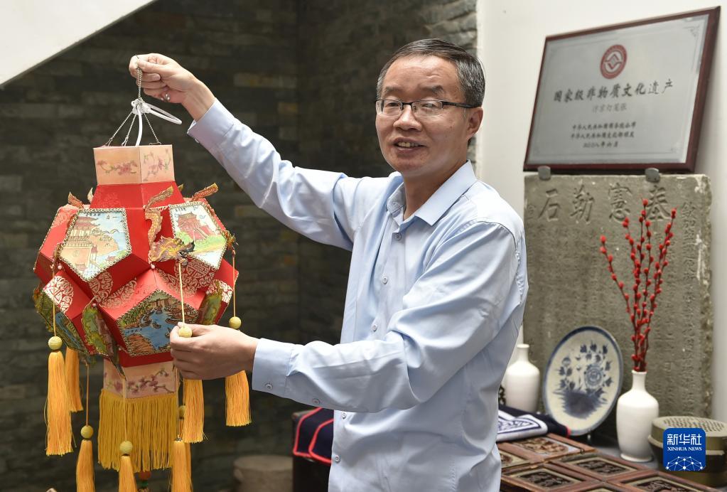 6月7日,張俊濤在開封市“汴京燈籠張”彩燈展覽館內展示彩燈。