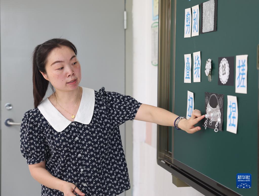 6月9日,湖南省長沙市朝陽小學王曉風老師在特色美育課上向學生們介紹制作技藝。