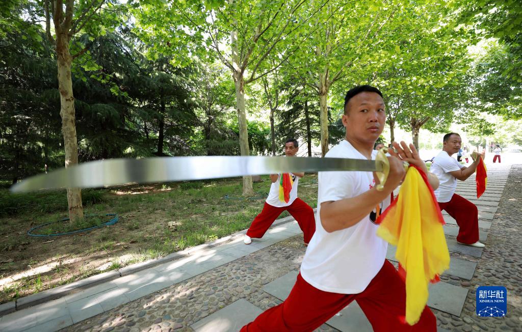 6月9日,太極拳愛好者在河北省邢臺市任澤區人民廣場展示王其和太極拳器械太極刀。