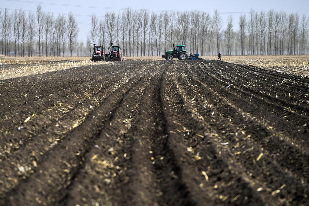4月20日,在吉林省公主嶺市秦家屯鎮王家窩堡村,農機在進行整地作業。新華社記者許暢 攝