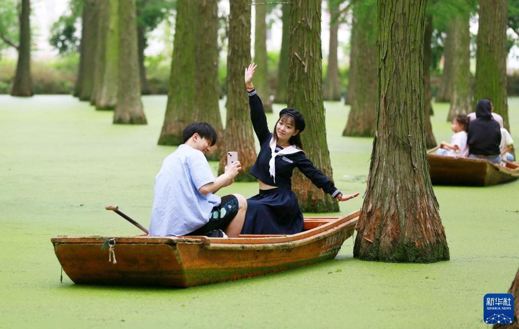 6月23日,在江蘇省揚州市江都區淥洋湖濕地公園“水上森林”,游客在拍照留影。