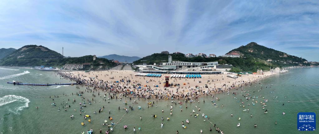 6月23日,游客在江蘇省連云港市連島大沙灣海濱浴場戲水納涼(無人機全景照片)。