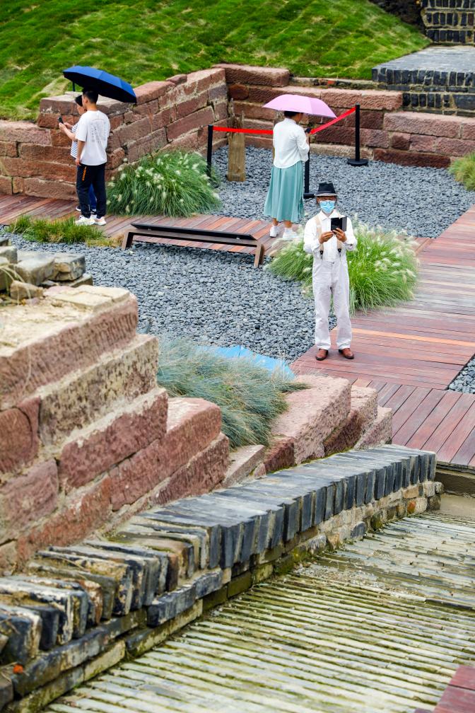 7月20日,在成都東華門遺址公園外場遺址區,人們在參觀原狀展示的水道踏道遺跡。新華社記者 沈伯韓 攝