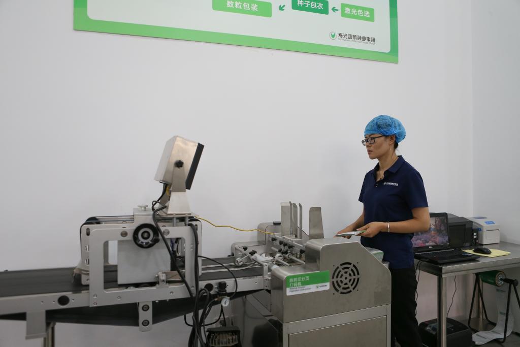 7月26日,山東壽光蔬菜種業集團工人在包裝車間給種子包裝袋打碼。(新華社記者張浩波 攝)