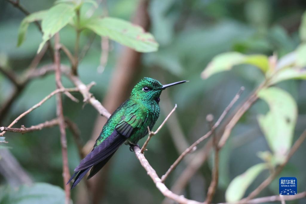 7月24日,哥斯達黎加蒙特韋德云霧森林生物保護區的一只紫刀翅蜂鳥停在林中。新華社記者 范小林 攝