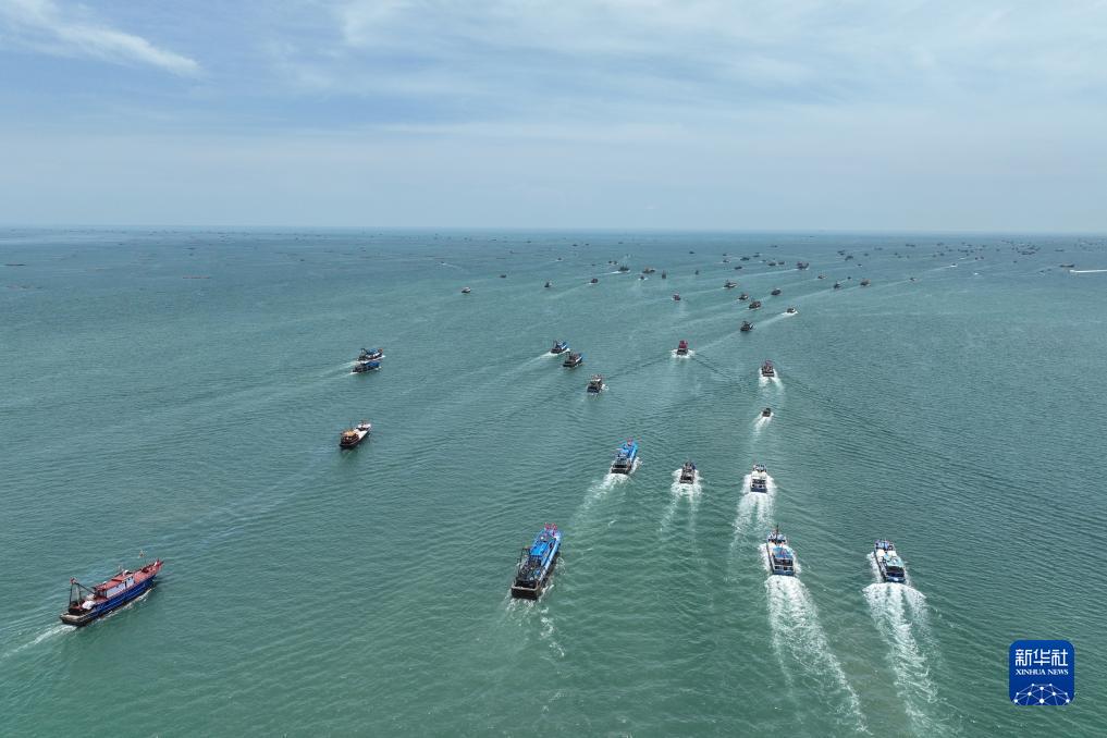 8月16日,漁船從海南省臨高縣新盈港駛向南海(無人機照片)。新華社記者 張麗蕓 攝