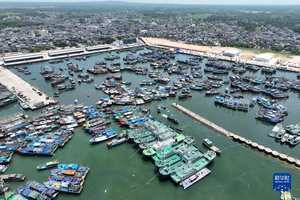 這是8月16日在海南省臨高縣新盈港拍攝的準備開漁的漁船(無人機照片)。新華社記者 張麗蕓 攝