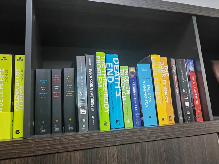 在陽泉劉慈欣工作室內擺放的多種語言譯本。新華社記者 王皓 攝