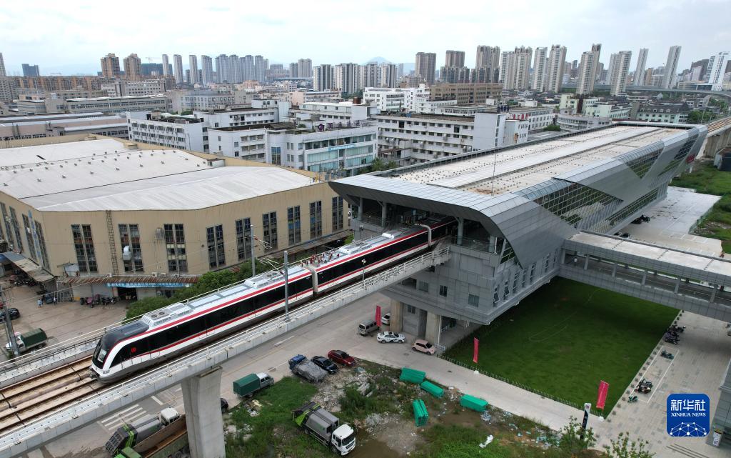 8月26日,溫州軌道交通S2線列車駛出瑞安市上東路站(無人機照片)。新華社發(莊穎昶 攝)