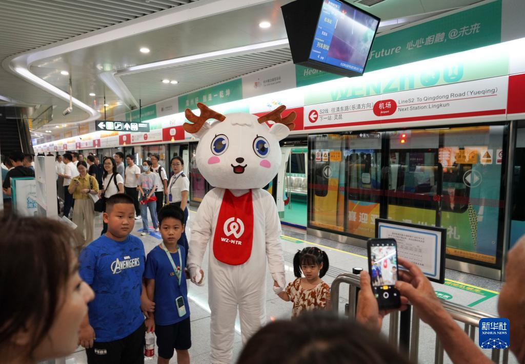 8月26日,在溫州S2線機場站,乘客在與吉祥物合影。新華社發(蘇巧將 攝)
