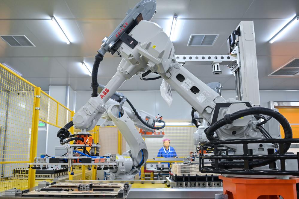 智能機器人在緯景儲能鹽城智造基地生產車間進行鋅鐵液流電池電堆總裝堆疊作業(9月8日攝)。新華社記者李博 攝