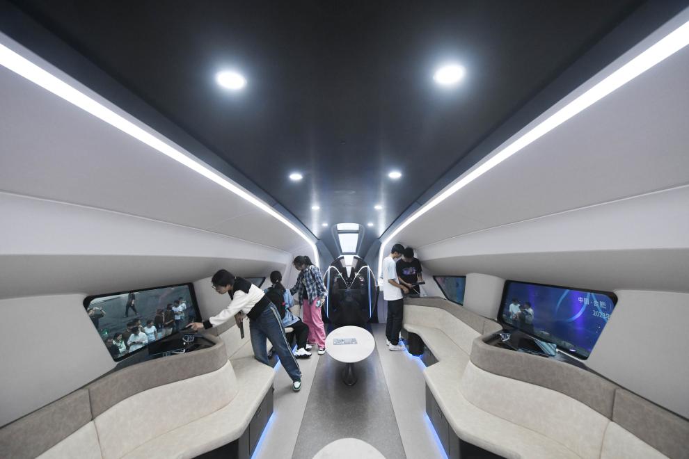 9月20日,在2023世界制造業大會上,觀眾近距離了解時速600公里高速磁浮交通系統。新華社記者 張端 攝