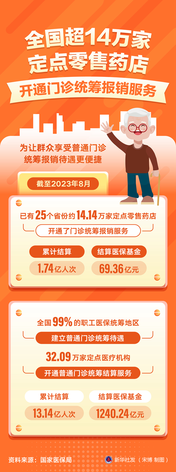 新華社北京9月22日電(記者彭韻佳、沐鐵城)為讓群眾享受普通門診統籌報銷待遇更便捷,截至今年8月,已有25個省份約14.14萬家定點零售藥店開通了門診統籌報銷服務,累計結算1.74億人次,結算醫?;?9.36億元。