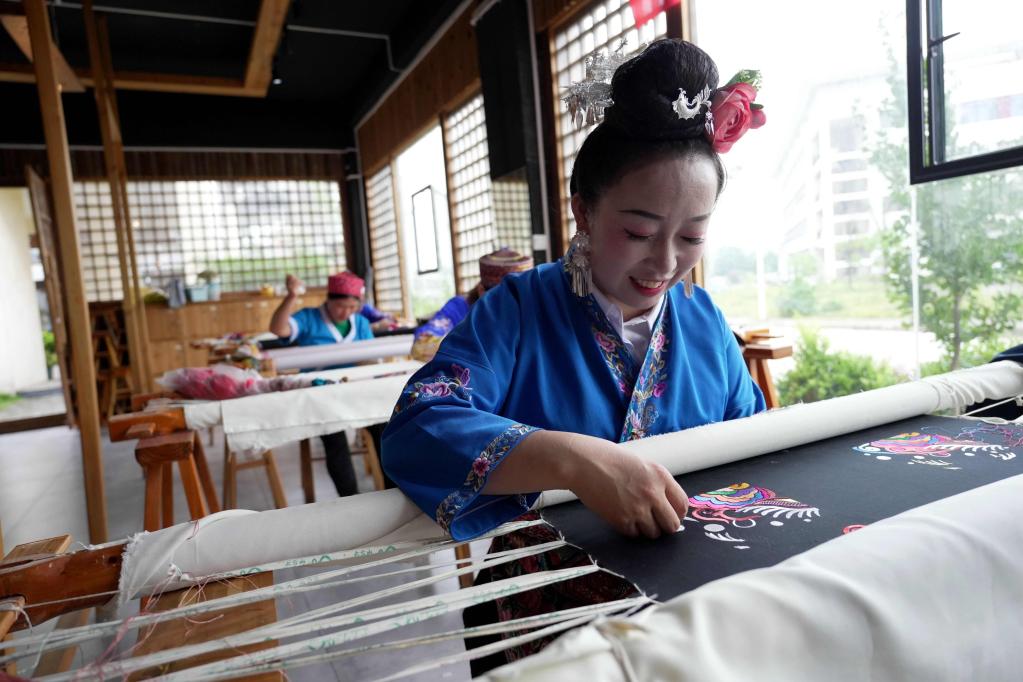 8月25日,繡娘在貴州省黔東南苗族侗族自治州施秉縣一家非遺企業苗繡生產車間趕制訂單。新華社發(王炳真攝)