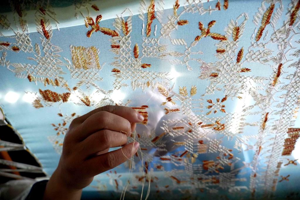 新華社米蘭/貴陽9月25日電 “這是數紗繡”“那里用的是破線繡”……2024米蘭春夏時裝周的展館里,身著苗族盛裝的兩位中國貴州繡娘一邊制作苗繡,一邊給外國友人介紹苗繡技法。