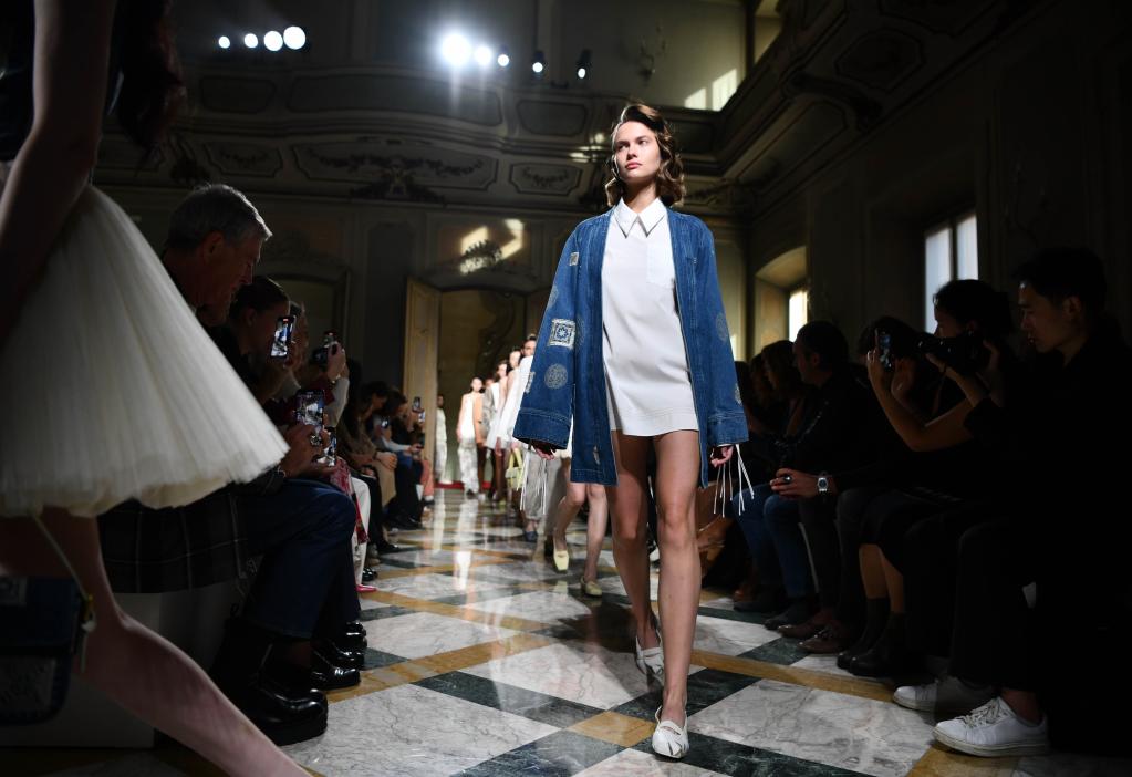 9月24日,模特在意大利米蘭時裝周上展示含有貴州苗繡元素的設計時裝。新華社記者金馬夢妮攝